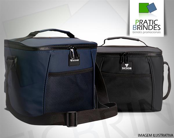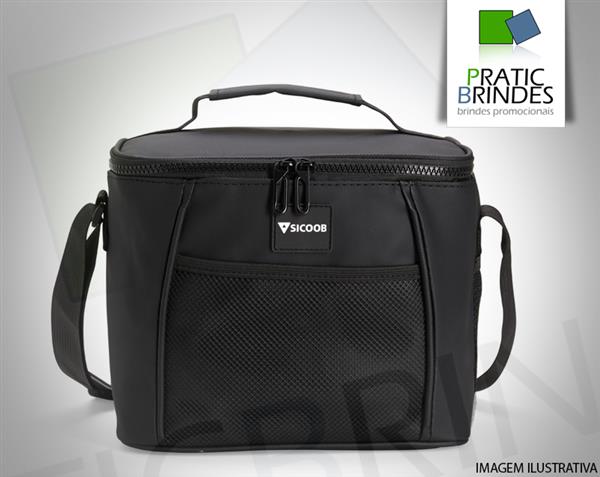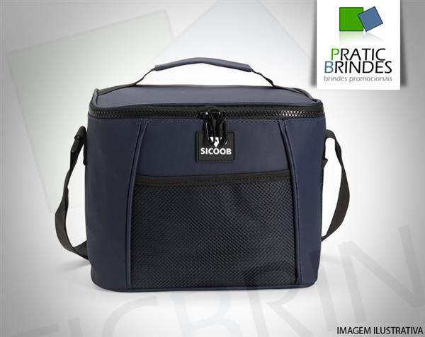 Bolsa térmica confeccionada em poliéster mesclado com PVC impermeável, fechamento em zíper e capacidade máxima de 10 litros. Conta com revestimento térmico em PEVA atóxico, o que oferece maior tempo para a conservação da temperatura de alimentos e bebidas. Apresenta placa emborrachada para personalização, dois bolsos abertos em tela de nylon com elástico, além de alça de mão e alça transversal. Tamanho aproximado: 18 x 21 x 16 cm (AxLxP).