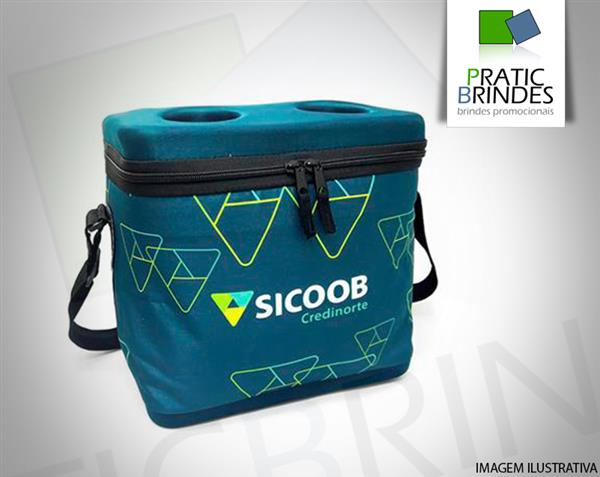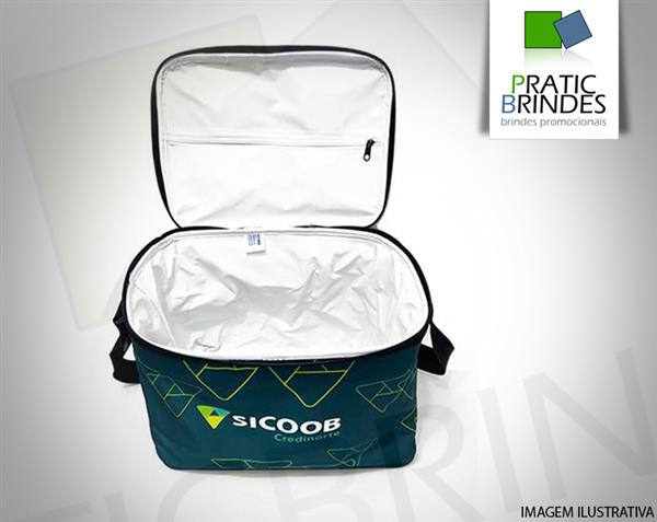 Bolsa Térmico em Nylon 70 PVC ou Poliéster 600 resinado, com tampa e fundo em E.V.A. revestidos em helanca. Possui alça de ombro de 40 mm, bolso interno com zíper e isolante térmico em isomanta, além de ser revestida internamente com bagun espelhado de 0,30 mm. O fechamento é realizado por solda eletrônica, garantindo 100% de impermeabilidade. As dimensões são 30 x 22 x 30 cm (capacidade aproximada de 17 litros), suportando até 12 garrafas long neck ou 18 latas de 350 ml.