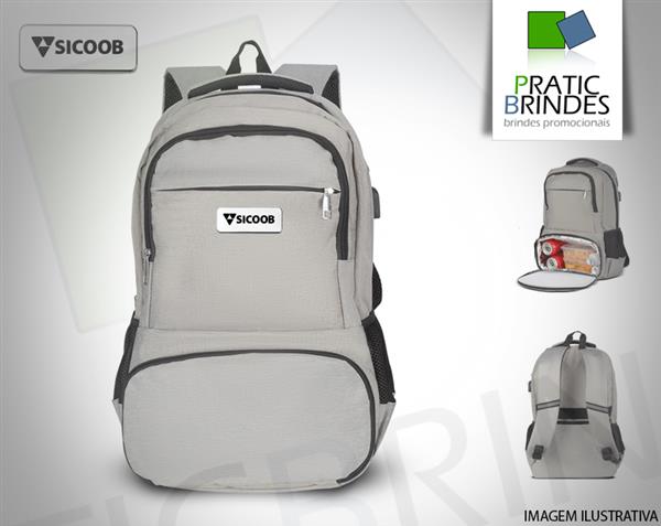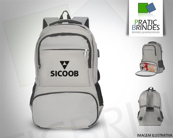 Mochila para notebook confeccionada em tecido RPET 300D, combinada com revestimento interno em poliéster 210D, o modelo possui compartimento térmico integrado, projetado para manutenção da temperatura de alimentos ou bebidas durante o transporte, mochila apresenta dois bolsos laterais de acesso rápido, saída para fone de ouvido e uma entrada USB externa que permite conexão direta com um power bank alocado internamente (ítem não incluso), conta também com um bolso central frontal destinado à organização de itens, compartimento superior acolchoado para notebooks de 13", com volume de até 14,4L, compartimento inferior térmico soldado com capacidade de 7,5 litros, dimensão do compartimento térmico: 16 x 30 x 16 cm (AxLxP), da mochila total 50 x 37 x 19 cm (AxLxP).