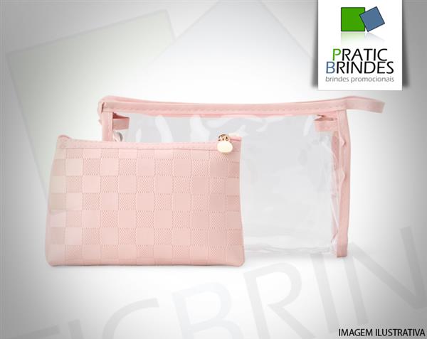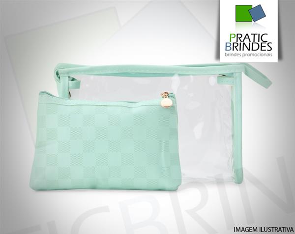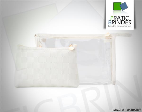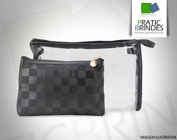 Conjunto de dois nécessaires em tamanhos diferentes. O modelo maior é confeccionado em PVC impermeável, traz detalhes em couro sintético, alça lateral prática e fechamento em zíper. Já o menor, produzido em PU impermeável, possui acabamento quadriculado e fechamento em zíper. Tamanho aproximado necessaire grande 16 x 24 x 5 cm (AxLxP), necessaire menor 12 cm x 18,7 cm x 2,5 cm (AxLxP).